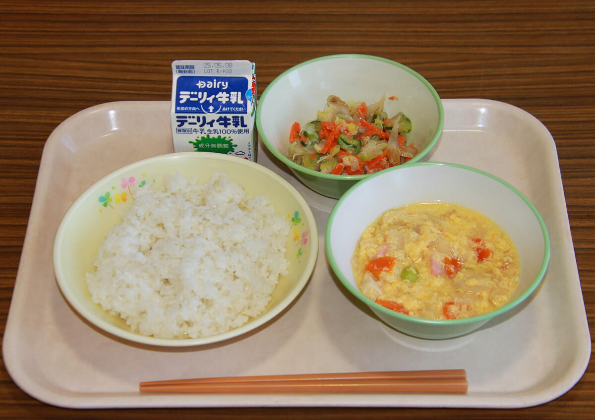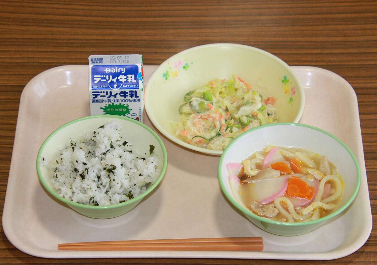 ワカメご飯、かしわうどん、野菜のマヨネーズ和え