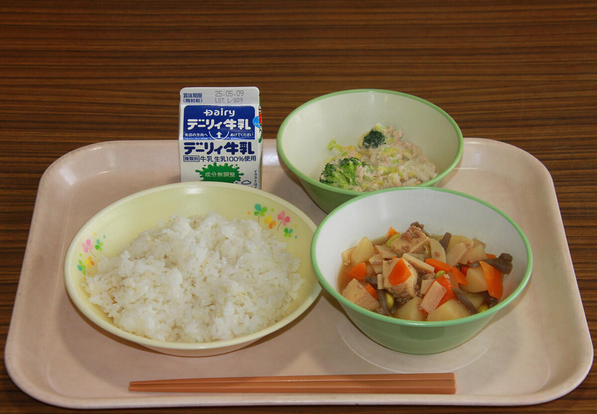 麦ご飯、ジャガ芋のそぼろ煮、ブロッコリーサラダ