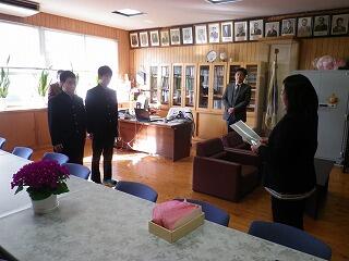 贈呈式では、更生保護女性会の田代智子様からお祝いのメッセージがあり、その後3年生を代表して津奈木勇輔さんと金澤弘瞬さんがメッセージとしおりを受け取りお礼の言葉を述べました。
