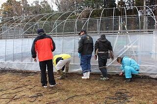 記念撮影をした後は、台風14号で倒壊したビニールハウスのビニール張りを手伝ってくださいました。