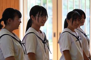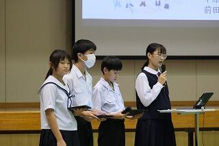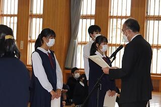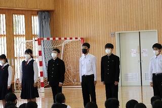 式では、1・2年生を代表して、大平落 結さん、戸髙 颯祐さんが修了証書を校長先生から受け取りました。その後、1・2年生並びに生徒会の代表生徒である植竹 奈々さん、柚木山 昊希さん、田村 詩子さんがそれぞれに1年間の振り返りと今後に向けて思いを語ってくれました。