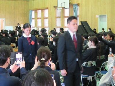3年生代表あいさつでは、上杉 湘さんから1、2年生への思い出と次の言葉をいただきました。「今年の3年生は人数が少なく行事があるたびにご迷惑をかけたかもしれませんが僕たちについてきてくれてありがとうございました。1年生は次、入学している1年生の手本になるように2年生は学校の顔として学校を盛り上げていってください。ありがとうございました。」