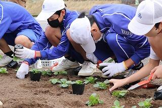 当日は気温が下がり、冷たい風の吹く中の作業となりましたが、限られた時間の中で1年生のチームワークが光り、みんなで協力し合って苗を植え、時間内に全て植えることができました。これからはこの道路を通る度に、みんなが花壇に目を向けることになるでしょう。