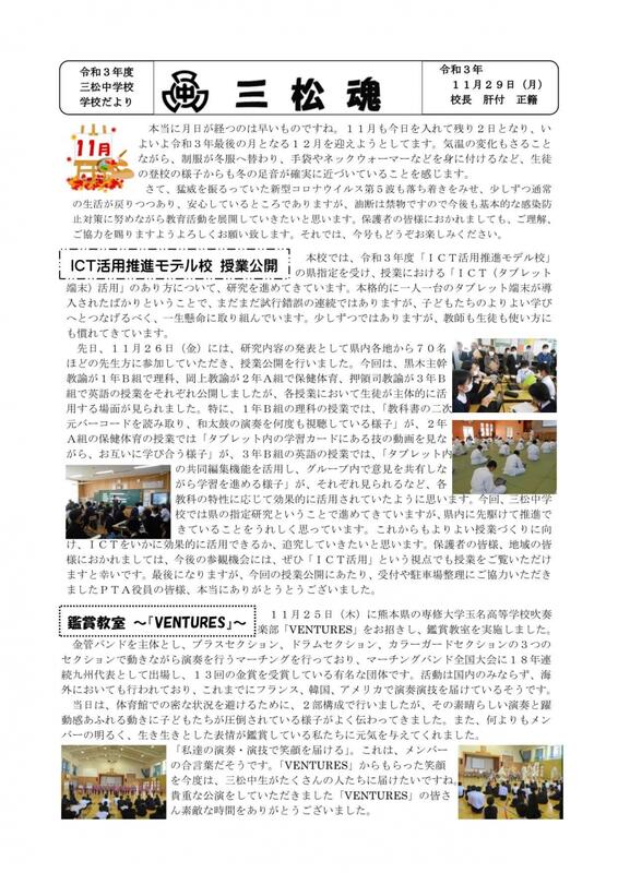 学校だより「三松魂」の令和3年11月号①を掲載しました