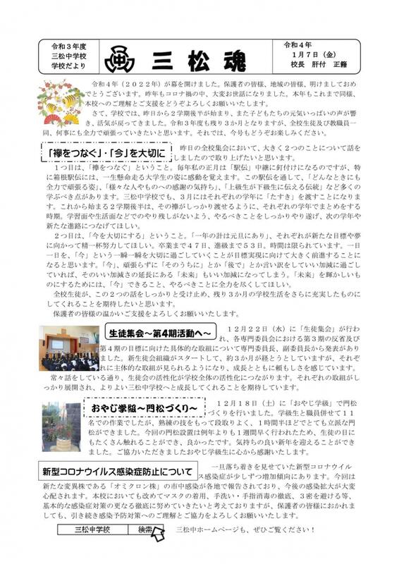 学校だより「三松魂」の令和4年1月号①を掲載しました