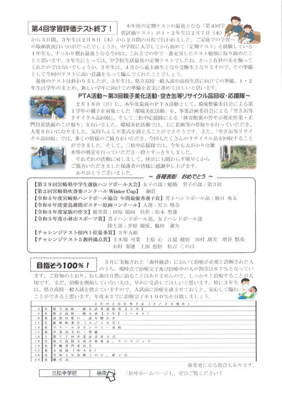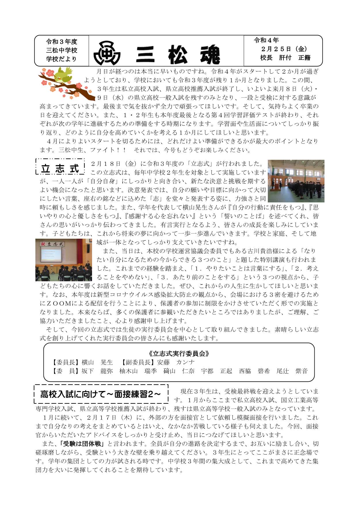 学校だより「三松魂」の令和4年2月号を掲載しました