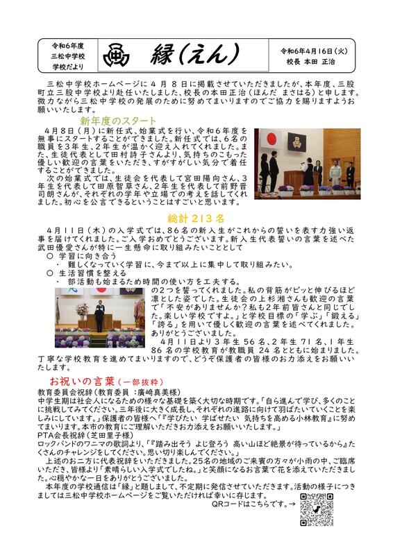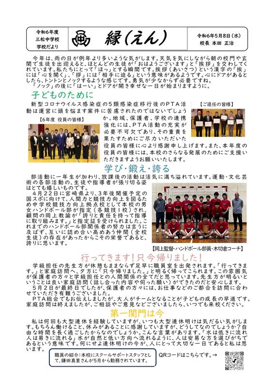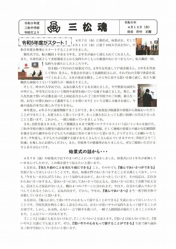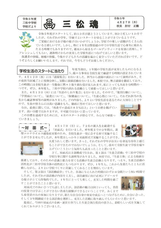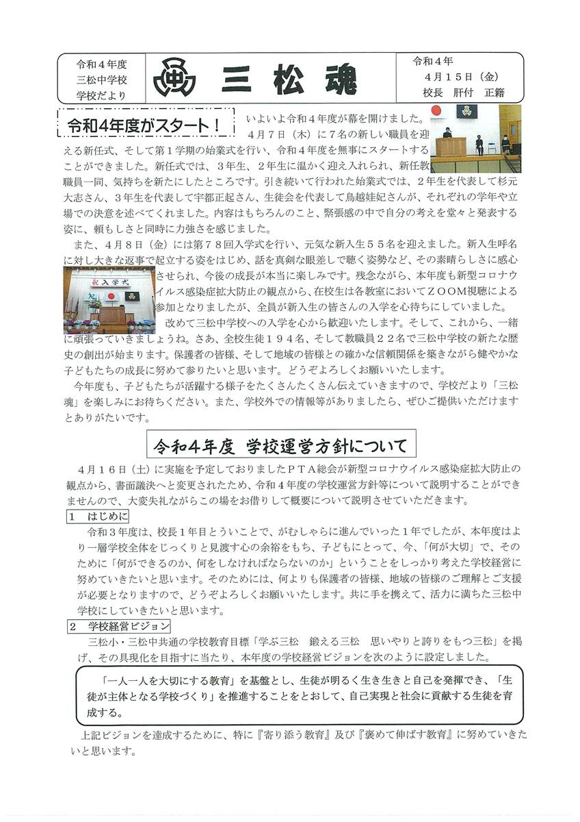 学校だより「三松魂」の令和4年4月号を発行しました。