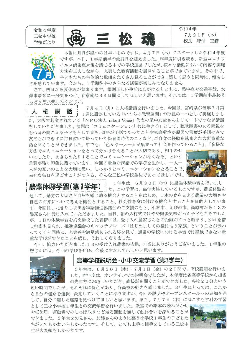 学校だより「三松魂」の令和3年7月号を掲載しました