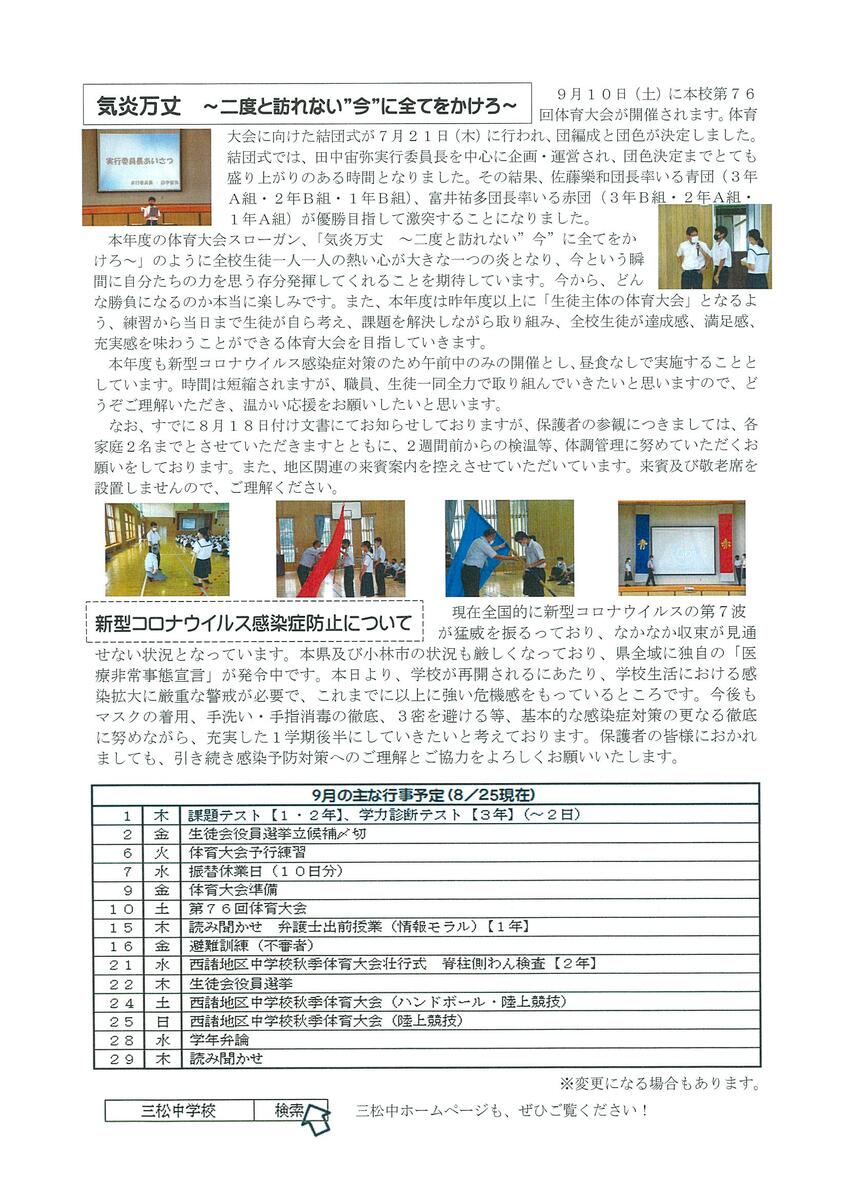 学校だより「三松魂」の令和3年9月号①を掲載しました
