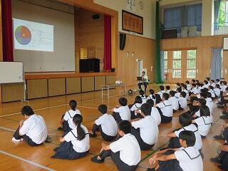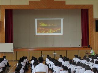 金曜日は火山噴火を想定した避難訓練が行われました。避難訓練の後は宮崎県防災士ネットワーク西諸県支部の大山支部長様をお招きして講話をしていただきました。講話では地球の構造や火山と地震の仕組みなどを分かりやすく説明していただき、実際に自然災害の大きさや怖さ、地震に対する心構えを学びました。