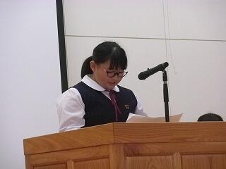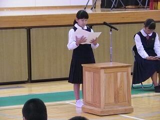 学年代表の発表では、1年生の田中沙英さん、2年生の赤嶺ひかりさん、3年生の谷口愛珠さんが壇上に立ち、あいさつをはじめとした積極的な行動、学習への取り組み、生活のあり方、受験生としての心構えなど、1学期の反省と2学期に努力すべきことを発表しました。