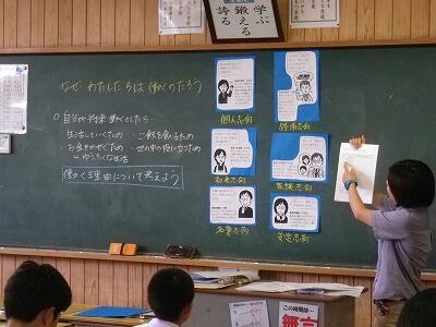1年生の学級活動の時間で「なぜ、わたしたちは働くのだろう」と題して、人が働く理由を考え、働くことの意義を理解し、働くことに対する自分の考えや気持ちについて伝え合うことをしました。