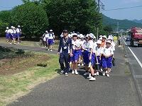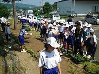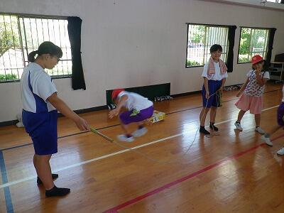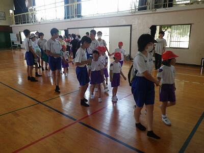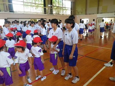今日の交流学習は体育館と運動場に分かれ、生徒たちが班を編成してゲームをはじめ、なわとびや風船を使った遊びなどを企画し小学生と一緒に活動しました。小学生はお兄さん、お姉さんが来てくれたことに本当に喜びたくさん駆け回っていましたが、生徒たちも小学生の喜ぶ姿に笑顔がこぼれていました。暑い中でしたがとても楽しい時間を過ごすことができました。