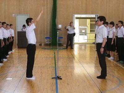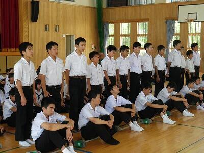今日は「平成30年度第69回宮崎県中学校総合体育大会」に出場する選手生徒を激励するため壮行式が行われました。壮行式では、大会に出場する各部の主将からのあいさつの後、生徒代表の岩切歌音さんからの激励の言葉、校長先生の話、そして男子バレーボール部主将の町浦陽介さんによる選手代表宣誓と続き、選手生徒は激励と誓いを胸に全力で試合に臨む気持ちを新たにしていました。