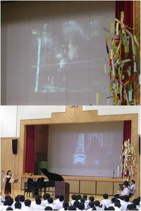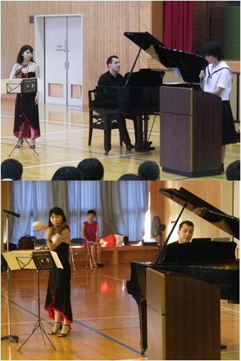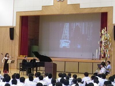 今日は加野さんとともに活動しているアルメニア出身のピアニストであるカレン・ハコビアン(Karen Hakobyan)さんも出演し、質の高いヴァイオリンとピアノの音色を響かせ生徒や保護者、そして合同で鑑賞教室に参加した三松小6年生の児童たちを魅了していました。また、鑑賞中にステージに映し出された映像や写真については、同じくニューヨークを拠点に活動する写真家の根尾有紀(ねおゆうき)さんが撮影したものです。