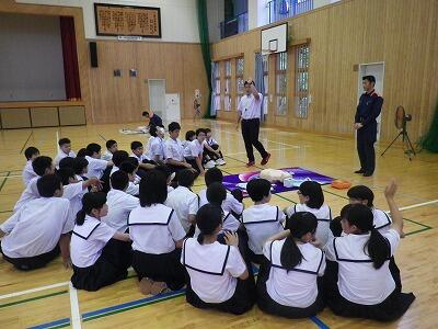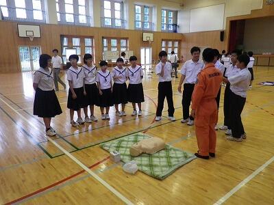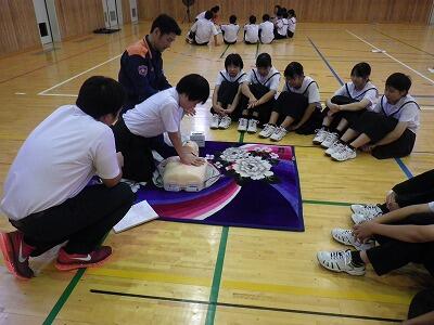 今日は西諸広域消防本部中央消防署から3名の署員の皆様を指導者としてお招きし、実際の救急法について指導を受けました。