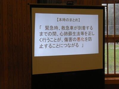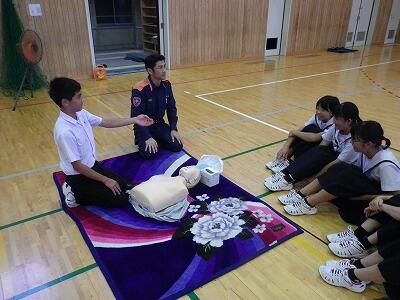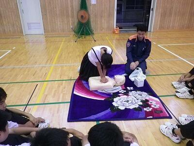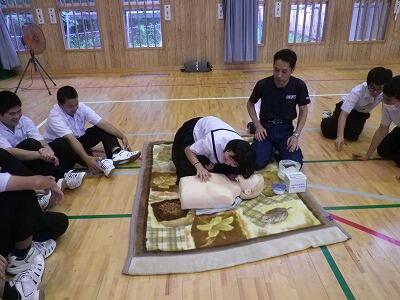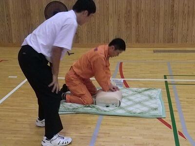 実技演習では、人体模型を使った胸骨圧迫と人工呼吸を実際に行いました。特に人工呼吸では気道確保が難しかったようですが、適切な指導を受けてからはうまくできるようになりました。
