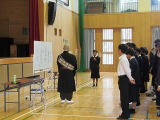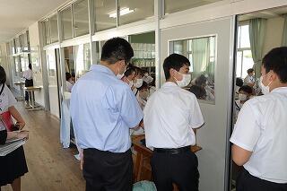 例年であれば、1年生と、2・3年生がそれこそ対面して行われるのですが、密閉、密接場面を避けるため体育館の窓を開け、また、生徒同士の間隔を空けて座って行われました。