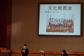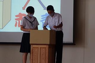 学年代表の発表では、1年生の田中沙英さん、2年生の赤嶺ひかりさん、3年生の谷口愛珠さんが壇上に立ち、あいさつをはじめとした積極的な行動、学習への取り組み、生活のあり方、受験生としての心構えなど、1学期の反省と2学期に努力すべきことを発表しました。