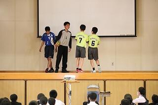 この清掃集会は、1年生にとっては小学校とは違った清掃のルールを知るため、2・3年生にとってはそのルールを再確認する場となります。特に、今年度は6校時終了後に清掃が行われるようになったこともあり、清掃の流れを視覚的に確認するために、生徒会によるデモンストレーションを見て、しっかりと学習をしていました。