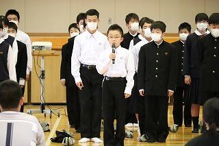 (各部抱負は、①男子バレーボール部→②女子ソフトテニス部→③軟式野球部→④男子ハンドボール部→⑤女子バレーボール部→⑥陸上競技部→⑦女子ハンドボール部→⑧剣道・弓道競技→⑨男子ソフトテニス部の順番で行いました。)