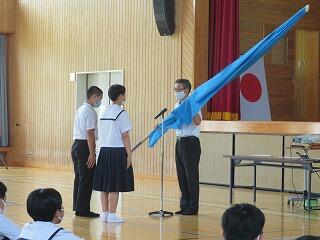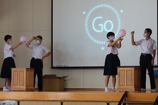 学年代表と生徒会代表の発表では、1年生の横山凌太さん、2年生の滝口俊人さん、3年生の蔵本亘さん、そして生徒会長の岩切歌音さんが壇上に立ち、1学期を振り返ったうえで、授業態度のあり方、自宅学習への取り組みを中心に2学期でがんばっていきたいことを発表しました。