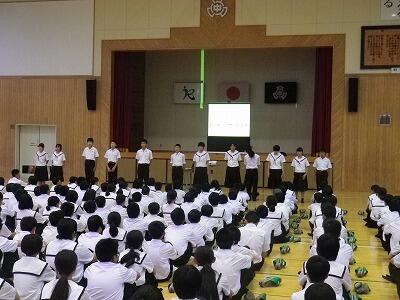 1学期前半終了にあたって全校集会が開かれました。校長先生からは、4月に各学年に投げかけた言葉を思い出してほしいとの話がありました。1年生は三松中の目標「学ぶ、鍛える、誇る」こと、2年生は「三松中のあるべき姿を1年生に見せる」こと、3年生は「行けるのではく、行きたい進路を目指す」ことでした。生徒の皆さんは実践できたかどうかぜひ振り返ってほしいです。
