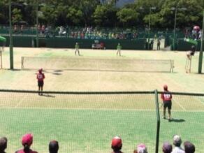 連日35度を超える猛暑日の中、県総合運動公園では、ソフトテニス競技が行われました。