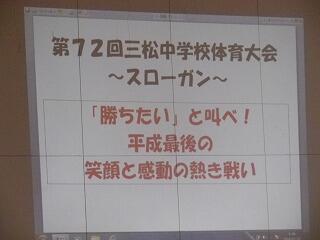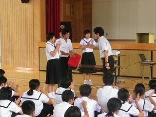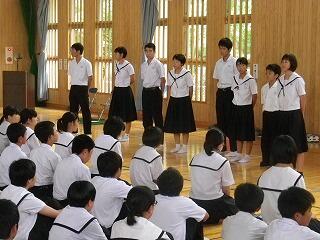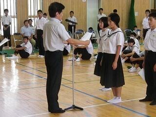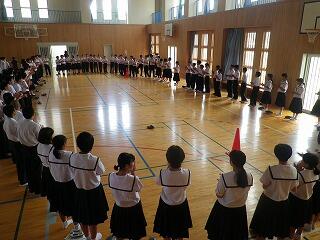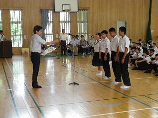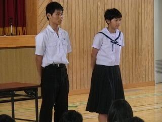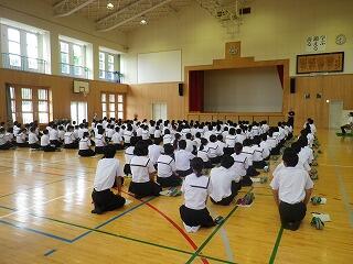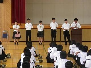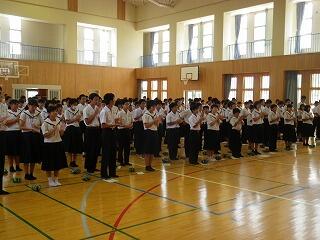 1学期前半終了にあたって全校集会が開かれました。校長先生からは、4月に各学年に投げかけた言葉を思い出してほしいとの話がありました。1年生は三松中の目標「学ぶ、鍛える、誇る」こと、2年生は「三松中のあるべき姿を1年生に見せる」こと、3年生は「行けるのではく、行きたい進路を目指す」ことでした。生徒の皆さんは実践できたかどうかぜひ振り返ってほしいです。