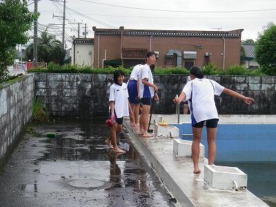 体育で水泳の授業が開始する前に生徒みんなでプールの清掃を行っています。今日はあいにくの雨模様でしたが、雨に負けずに生徒たちはプールや脱衣室、消毒槽など熱心に清掃していました。
