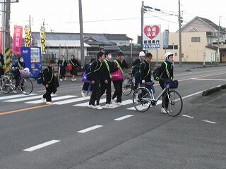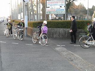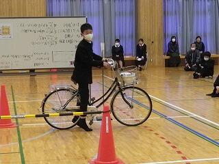 後半では交差点の通行方法などについて数名の生徒が実演を行いました。いざとなると緊張も感じているようでしたが、その緊張感が自分の身を守るためにとても大切だと思います。