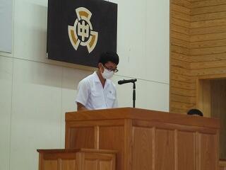 学年や生徒会の代表者が、1学期の振り返りや2学期に向けての抱負(目標)を述べました。