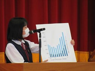 学年弁論大会は、夏休みの課題として書いた全員の意見文の中から、文化発表会で学年代表として発表者を決めるためのものです。各学年とも各学級から2名選出され、合計4名の生徒が自ら選択したテーマに対する意見、対応策等を発表していました。全代表者は以下の12名です。