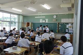午後からの授業では、中学生との交流会で、生徒会から三松中学校の説明や全国いじめ問題子供サミットの報告を兼ねて、中学校でのいじめ問題の取組を紹介しました。