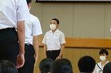 例年であれば、1年生と、2・3年生がそれこそ対面して行われるのですが、密閉、密接場面を避けるため体育館の窓を開け、また、生徒同士の間隔を空けて座って行われました。
