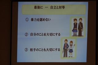 自分の体、心を大事にすることはもちろん、自分と同じように相手も大事にすることは、相手の心も体も未来も大切にすることにつながります。今回の講演を今後に生かしてほしいと思います。