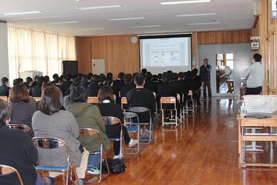 3年生は情報モラル教室として、学年主任の木上先生が講師となり、生徒と保護者を対象とした講話を行いました。文部科学省の啓発教材動画を用いたり、県の実態調査などを示したりしながら丁寧に説明を行い、皆さん熱心に聞いていました。