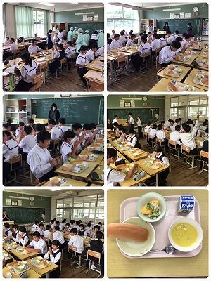 さて、今日は2年生の給食の様子です。中学生は心も体も飛躍的に成長する大切な時期です。毎日しっかりとした食事をすることで体をつくるだけでなく、学習に集中する力も身についていきます。学校給食は生徒たちの成長時期に合わせた栄養バランスが考えられて作られます。残さずしっかりと食べることを基本に指導を行っています。
