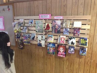 ↑ 図書室入口の横にすのこを利用した「去年から今年にかけて映画化された本」の紹介コーナーを設けました。たくさんの生徒がこのコーナーに注目しており大好評です!