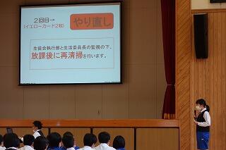 この清掃集会は、1年生にとっては小学校とは違った清掃のルールを知るため、2・3年生にとってはそのルールを再確認する場となります。特に、今年度は6校時終了後に清掃が行われるようになったこともあり、清掃の流れを視覚的に確認するために、生徒会によるデモンストレーションを見て、しっかりと学習をしていました。