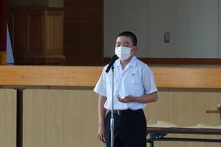 今年度の体育大会は、新型コロナウイルス感染防止等をふまえ、午前中開催となりましたが、実行委員長の田中大斗さんが、このような状況の中で開催されることに感謝をして臨みたいと話していました。