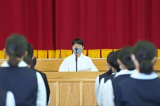 『オンライン社会の中で 三松中生はどうすべきか 今改めてあなたに考えてほしいこと』使用方法を間違えると、睡眠時間、学力、脳機能、体力、視力、コミュニケーションに悪影響を及ぼすこと等、健康と安全を中心に講話をいただきました。