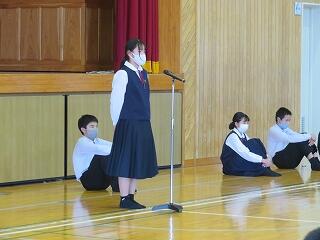 在校生代表の激励の言葉として、3年生の中窪惟翔さんが「県大会では、最後まであきらめず、練習の成果を十分に発揮してください。」とありました。