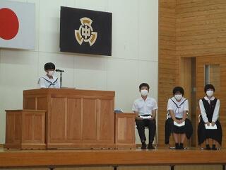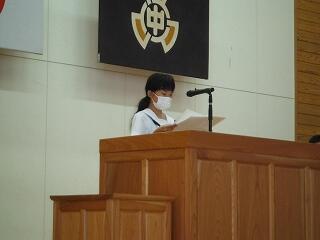学年や生徒会の代表者が、1学期の振り返りや2学期に向けての抱負(目標)を述べました。