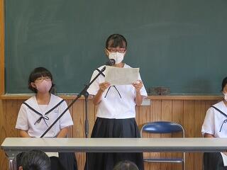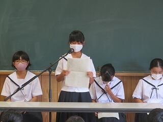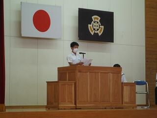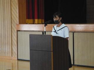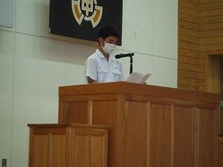 学年や生徒会の代表者が、1学期の振り返りや2学期に向けての抱負(目標)を述べました。