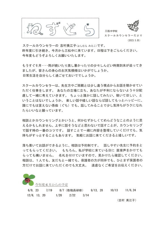 スクールカウンセラーだより「ねずとら」を掲載しました