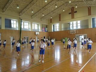 体育大会のダンスの練習がスタートしました。例年この時期は、水泳の授業ですが、7月から三松小学生が本校プールを使用することから、今週から体育大会の「ダンス(現代的なリズムのダンス)」の練習が始まりました。ダンス実行委員が創作したダンスを各学級で練習します。これまで本校の体育大会の特色は「組体操」でした。しかし、近年の生徒の体力低下による事故や練習時間の確保、またコロナ感染症予防対策から、昨年度から実施しておりません。