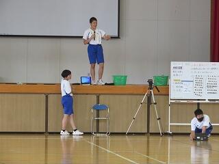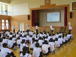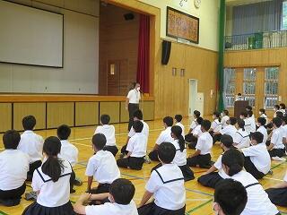 全校集会では、校長先生 毛上先生からお話がありました。毛上先生からは、自転車マナー違反についての話がありました。一旦停止違反や点字ブロック上への駐車による事故や事故になりかけた事例が校区内でも増えているとの事です。ご家庭でも指導をお願いいたします。