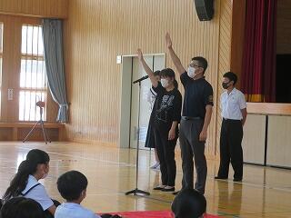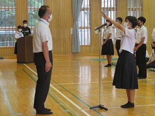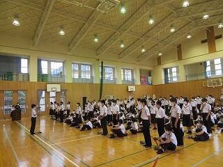 今週末から始まる宮崎県中学校総合体育大会及び県吹奏楽コンクールに向けての壮行式が15日(木)に行われました。