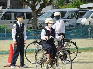 その後、交通安全協会の方から、自転車点検の方法をはじめ、見通しの悪い場所での運転の仕方について、丁寧に指導していただき、実際に自転車通学生が体験を通して学習しました。